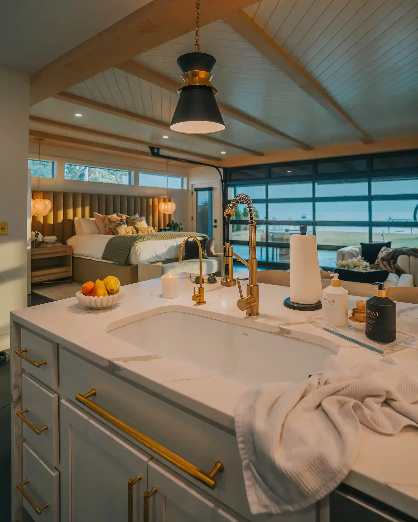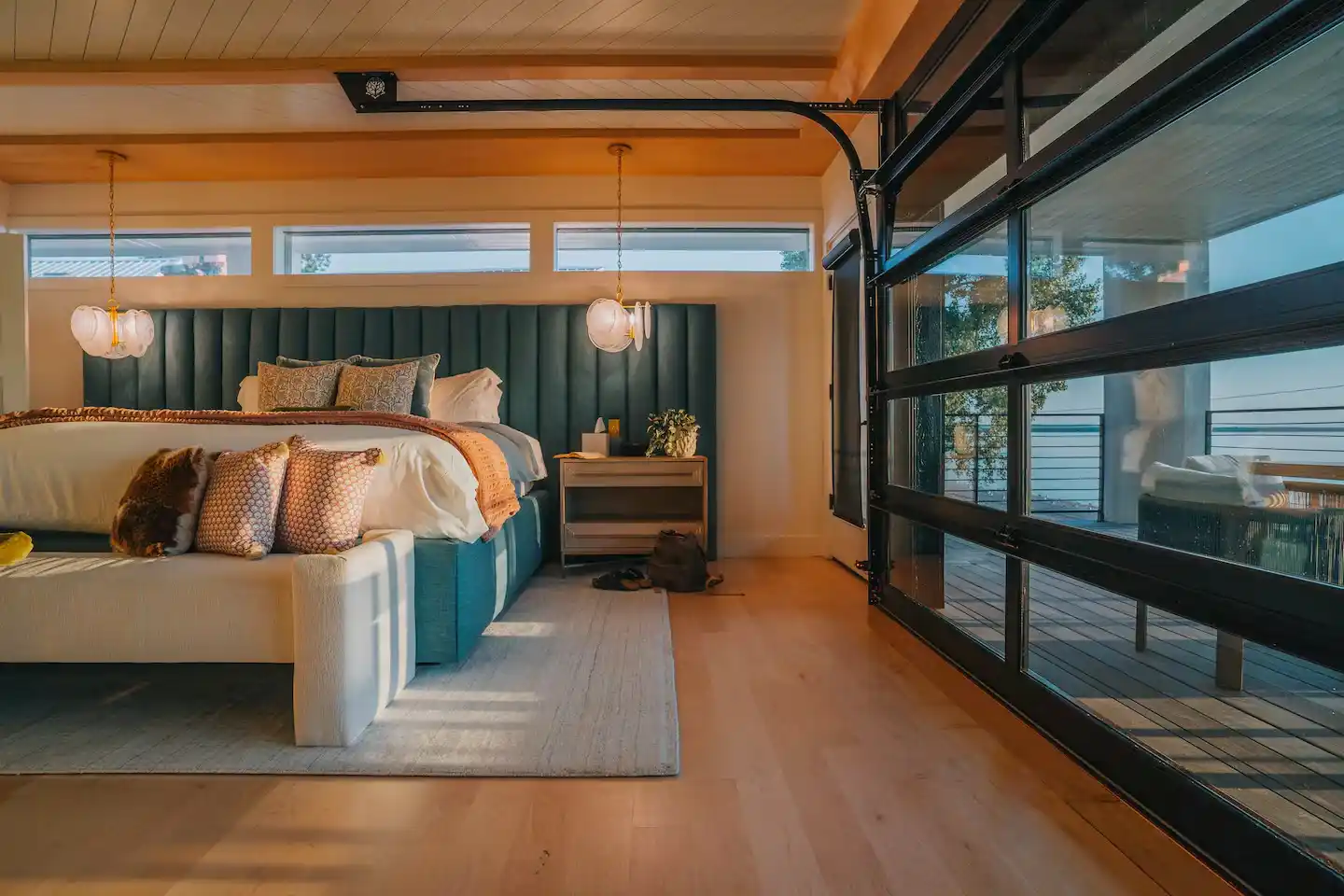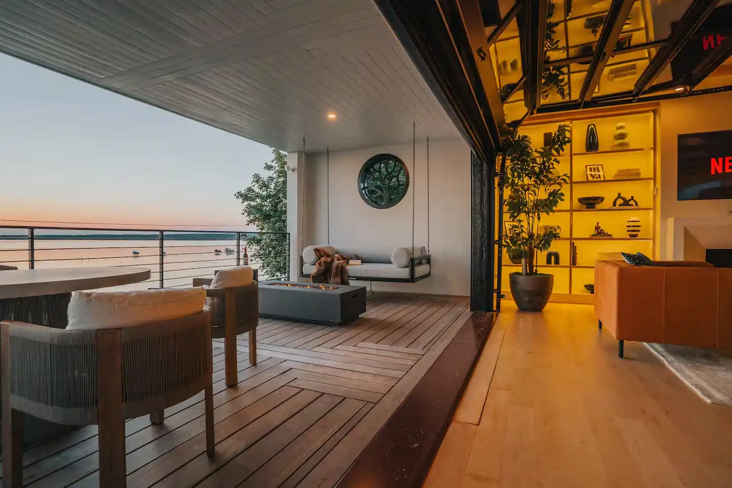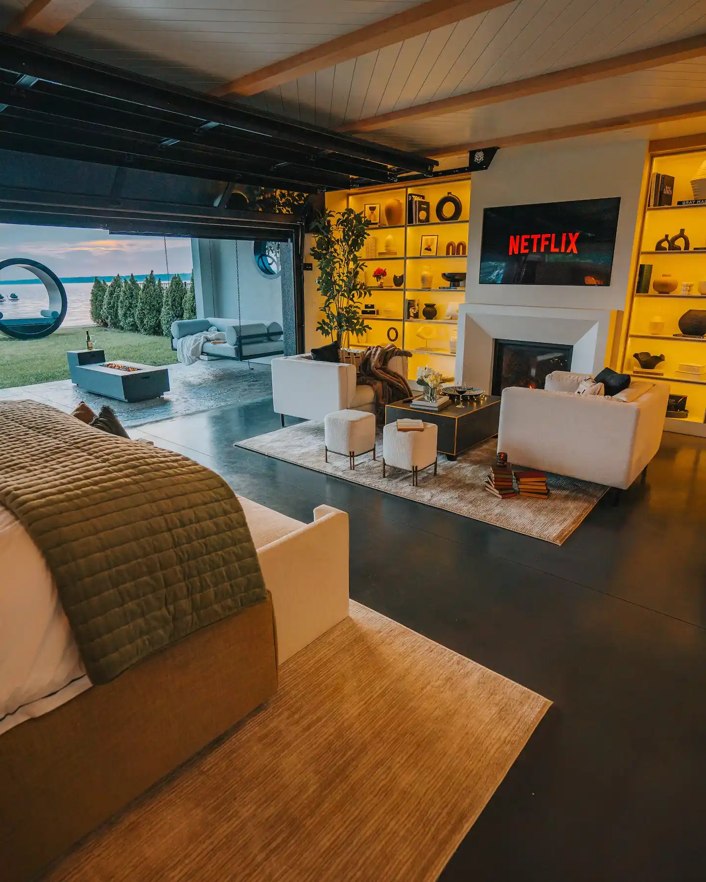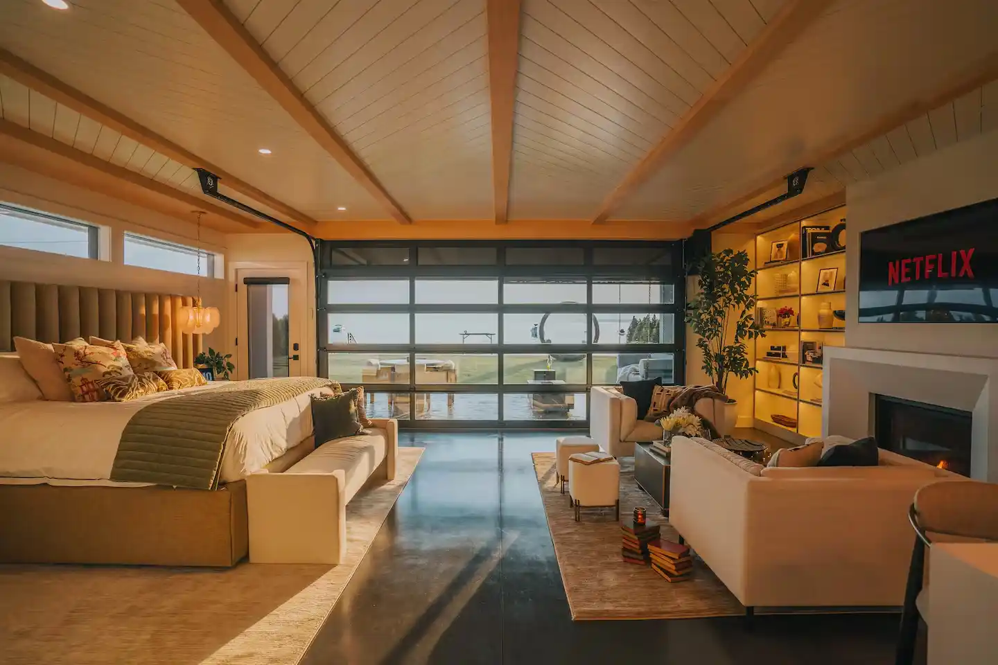 Open the massive doors and let the entire space breathe while you marvel at the million-dollar lake