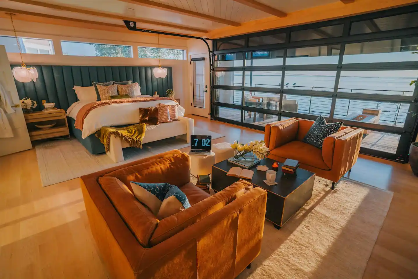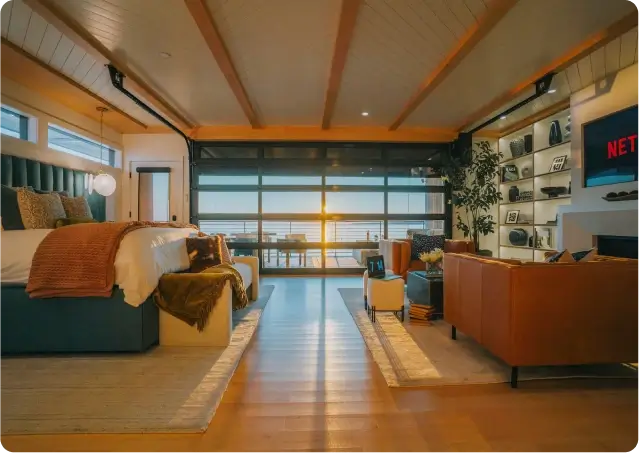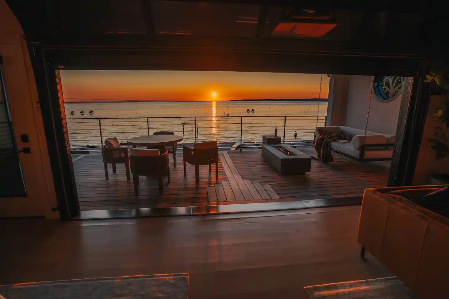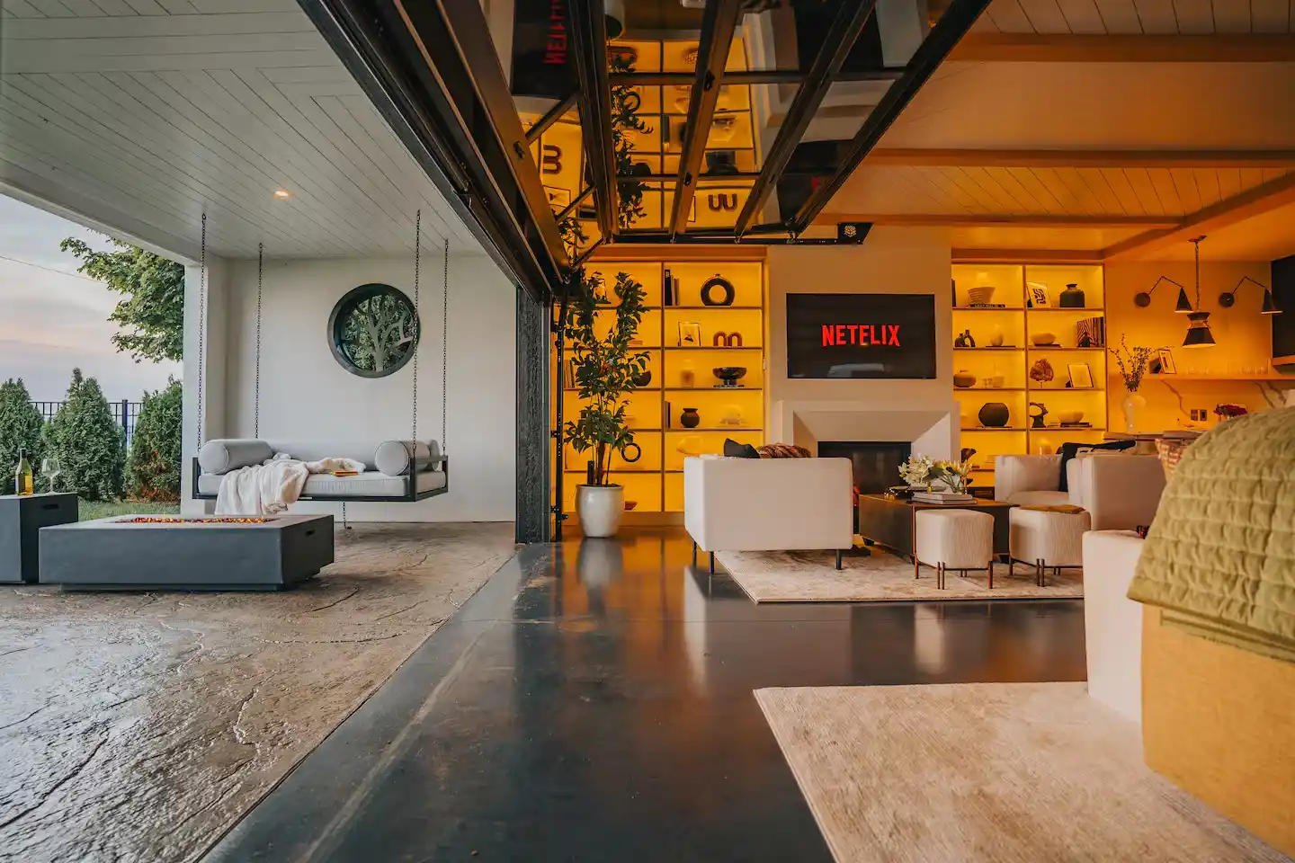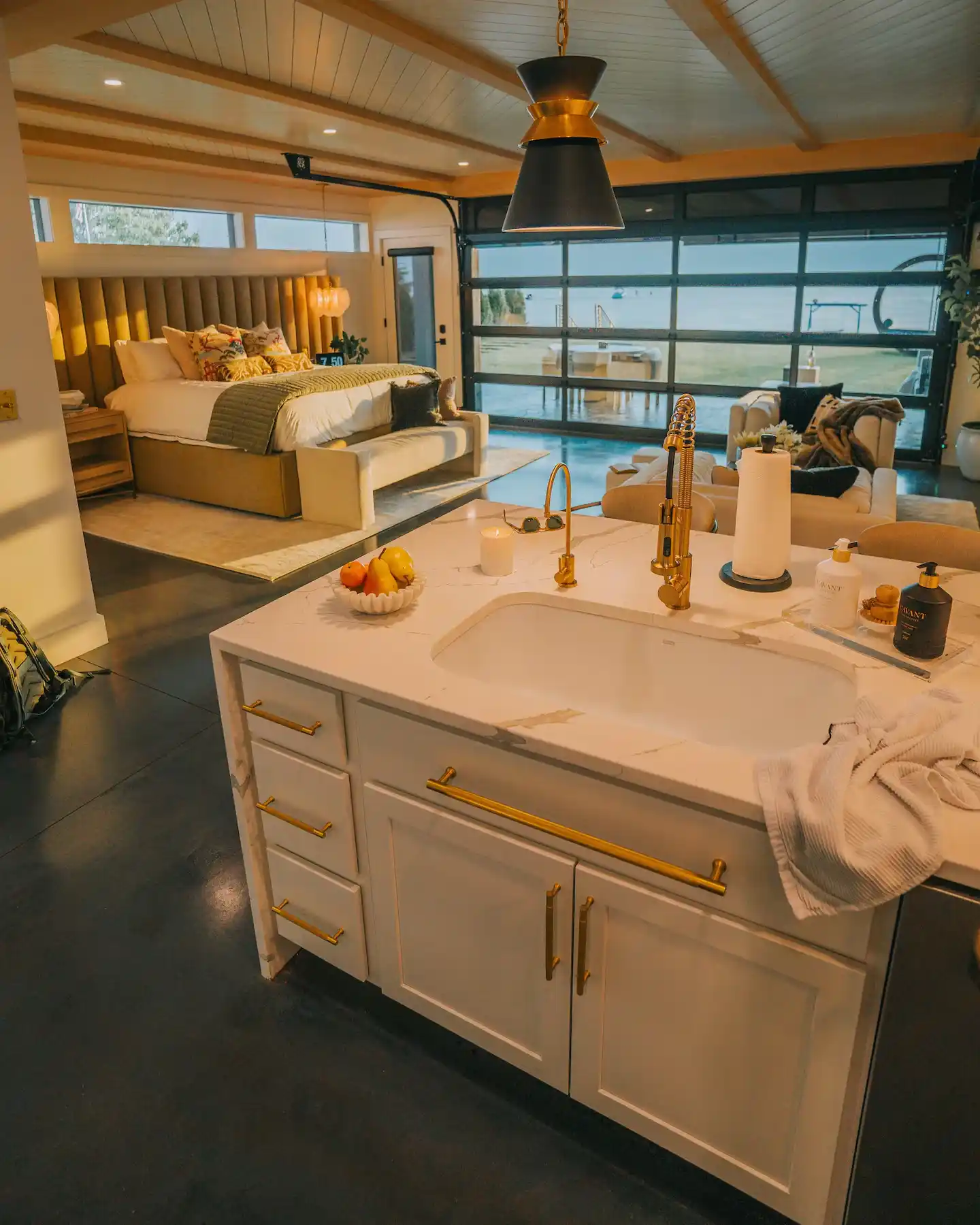 Open the massive doors and let the entire space breathe while you marvel at the million-dollar lake