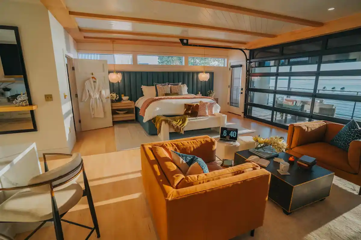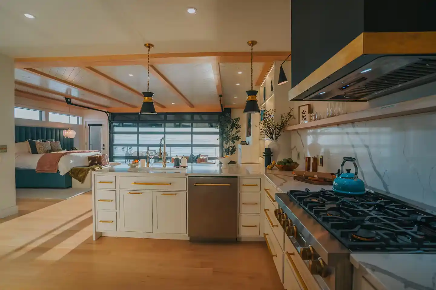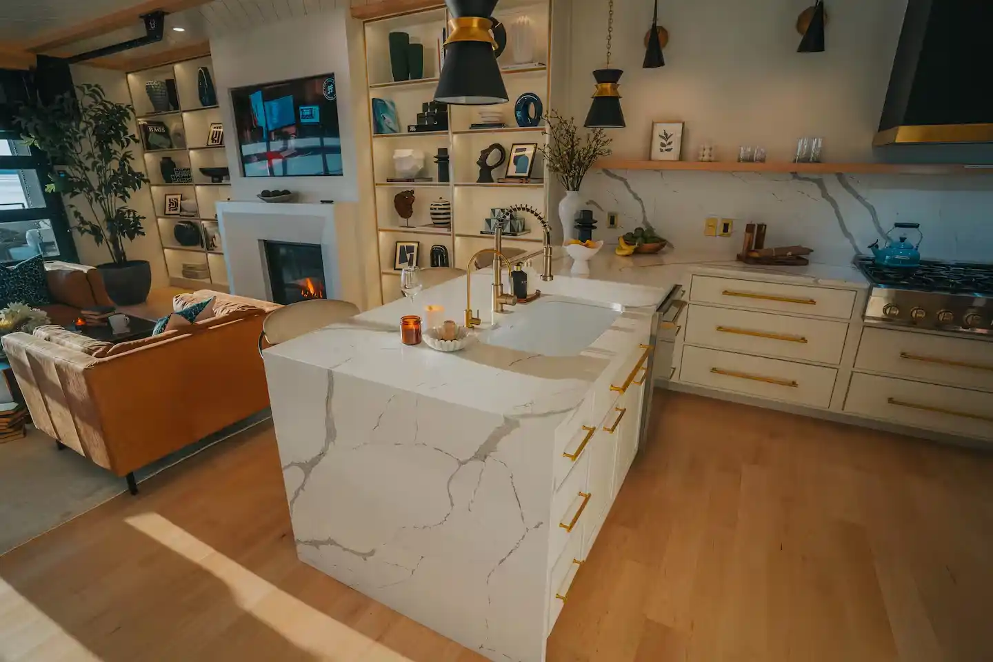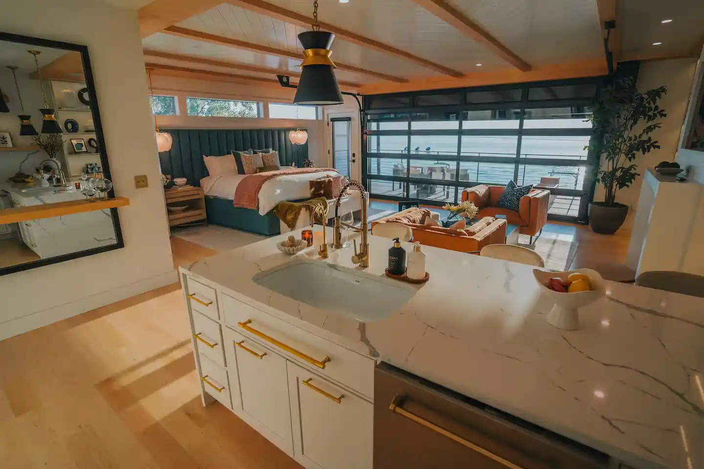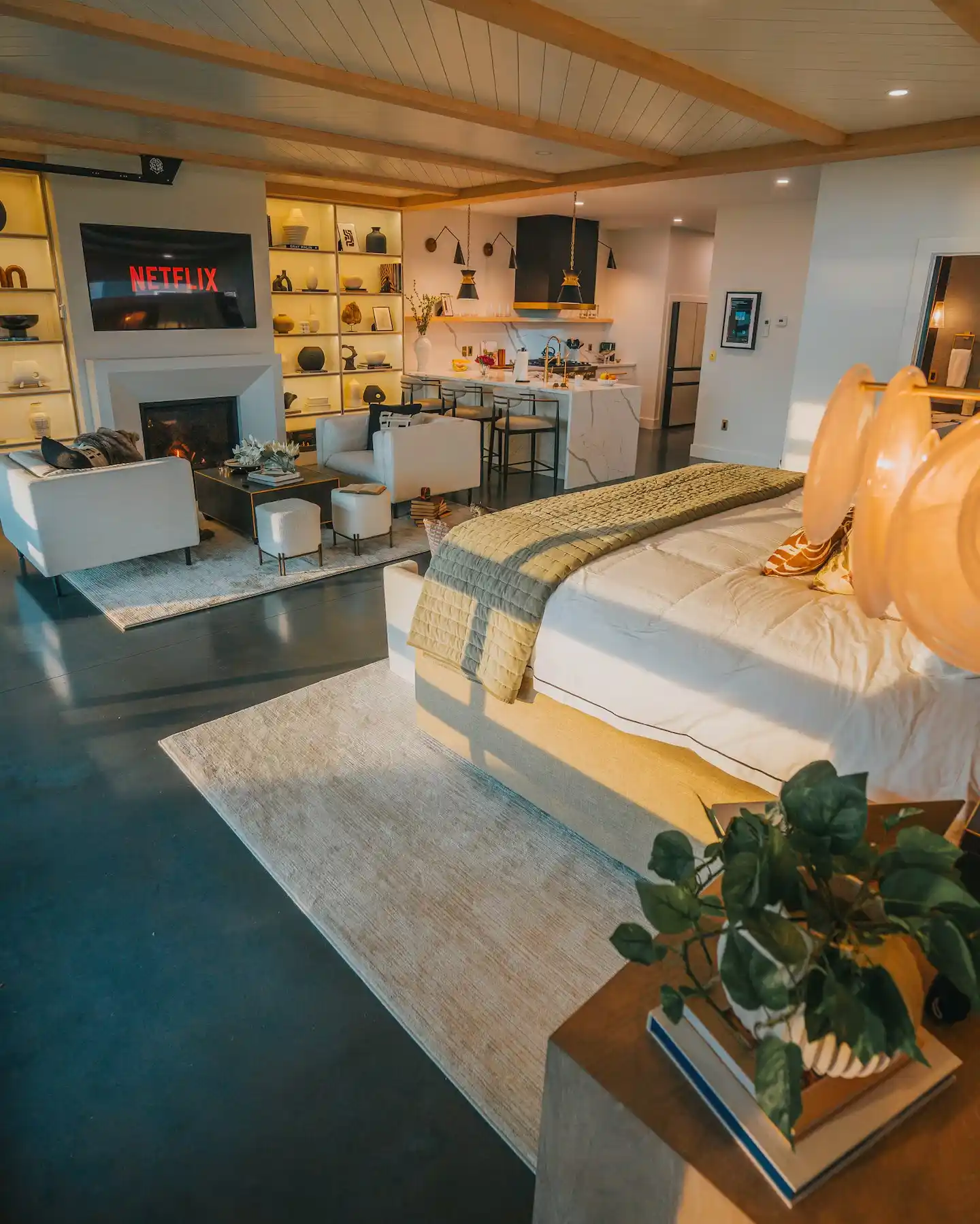 the high-end design and decor. This is best seen in the open-concept living area, which combines the