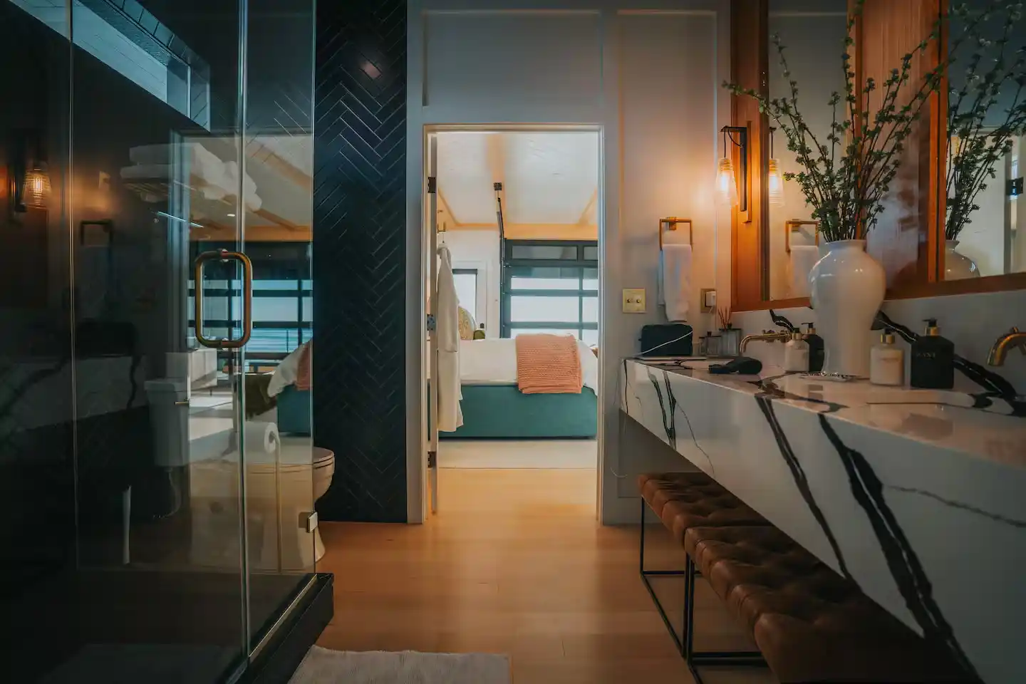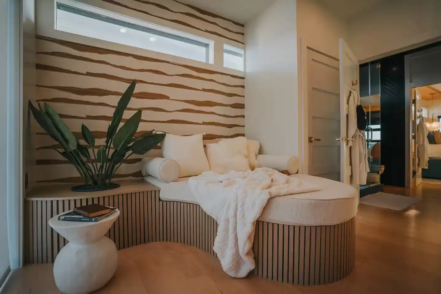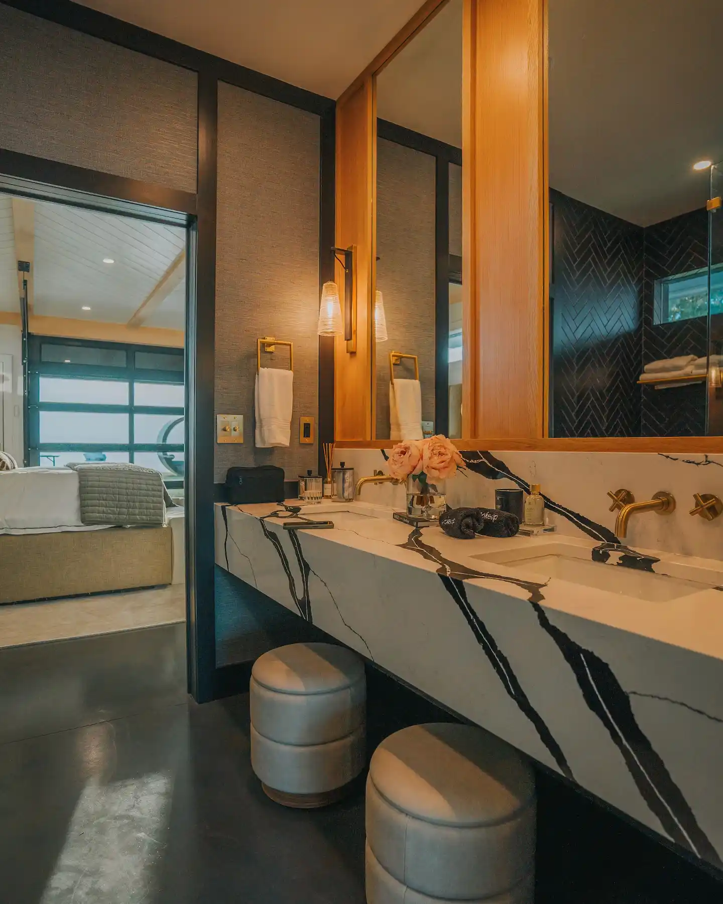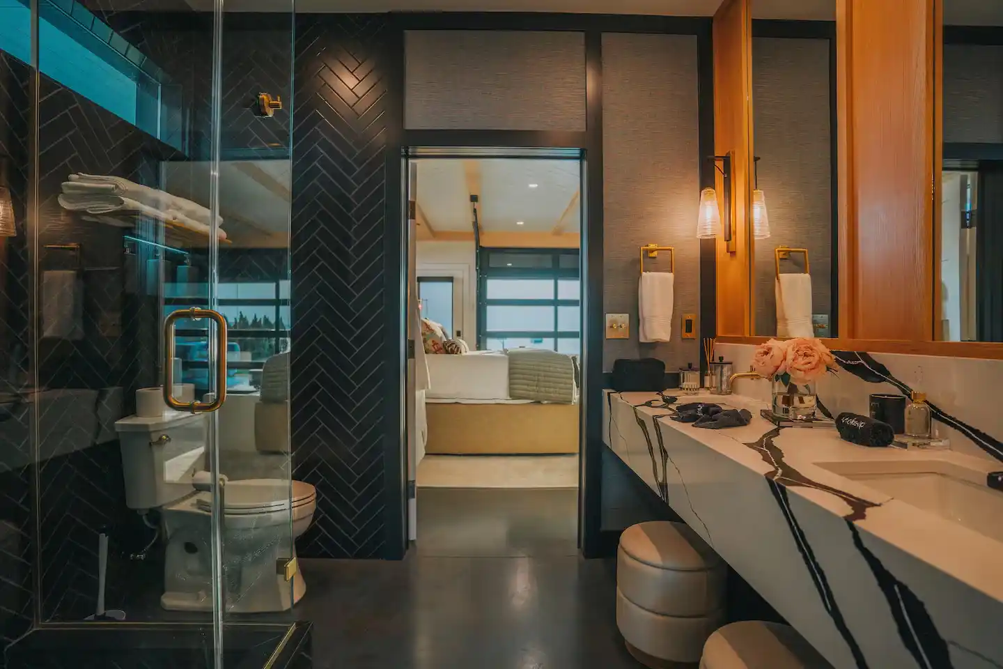 This home features a full bathroom with a high-end spa lounge, guaranteeing unparalleled comfort and