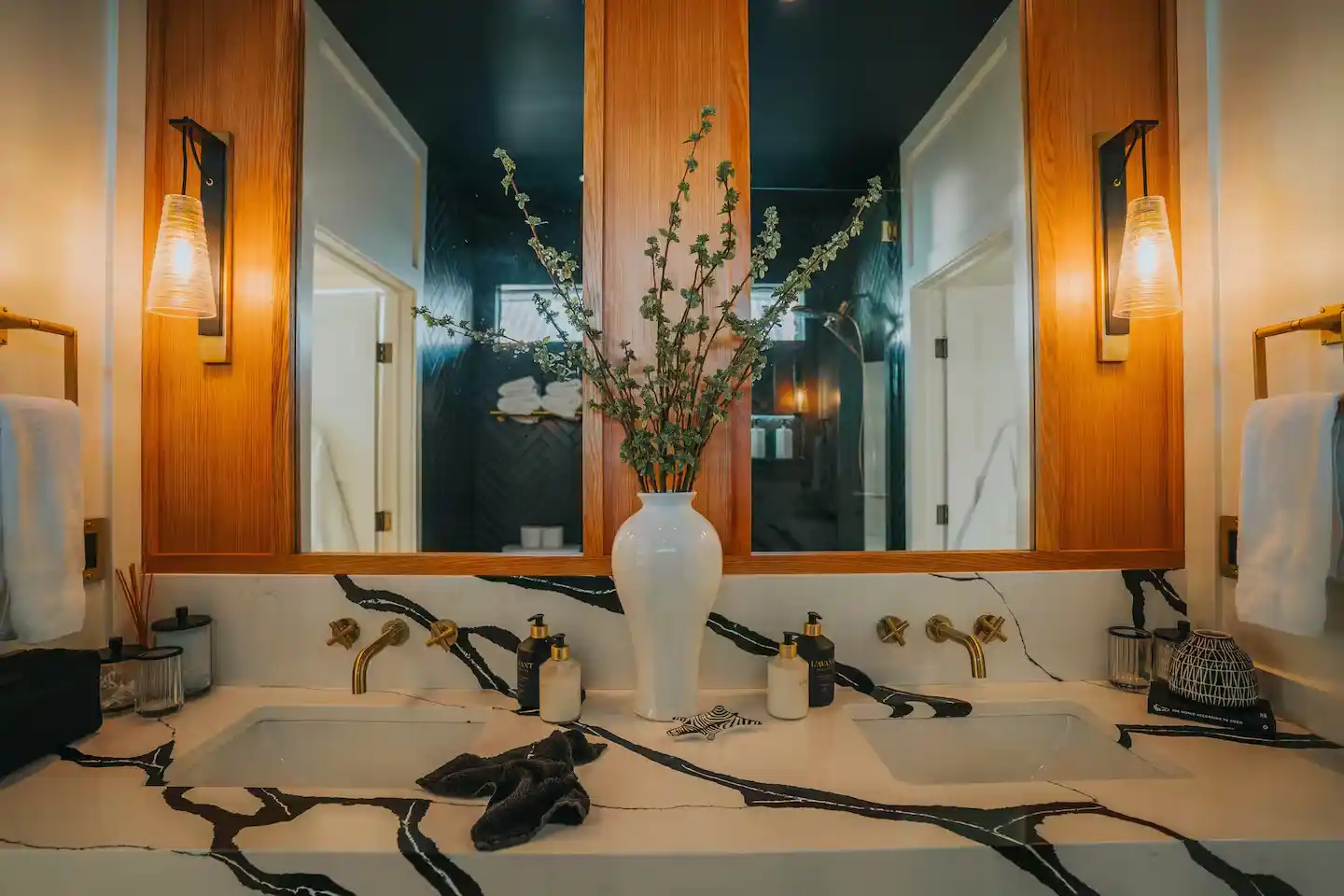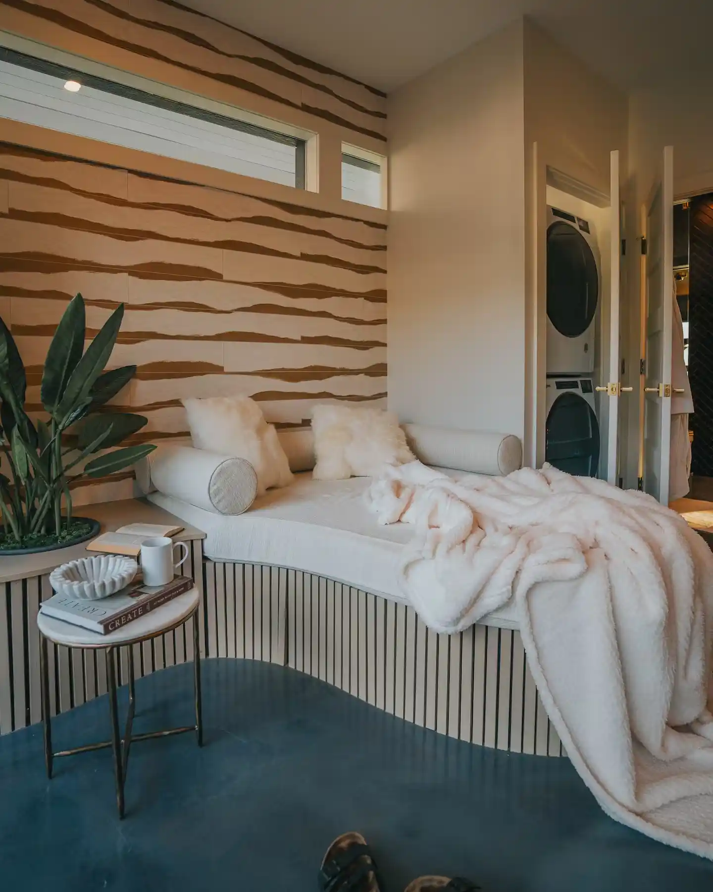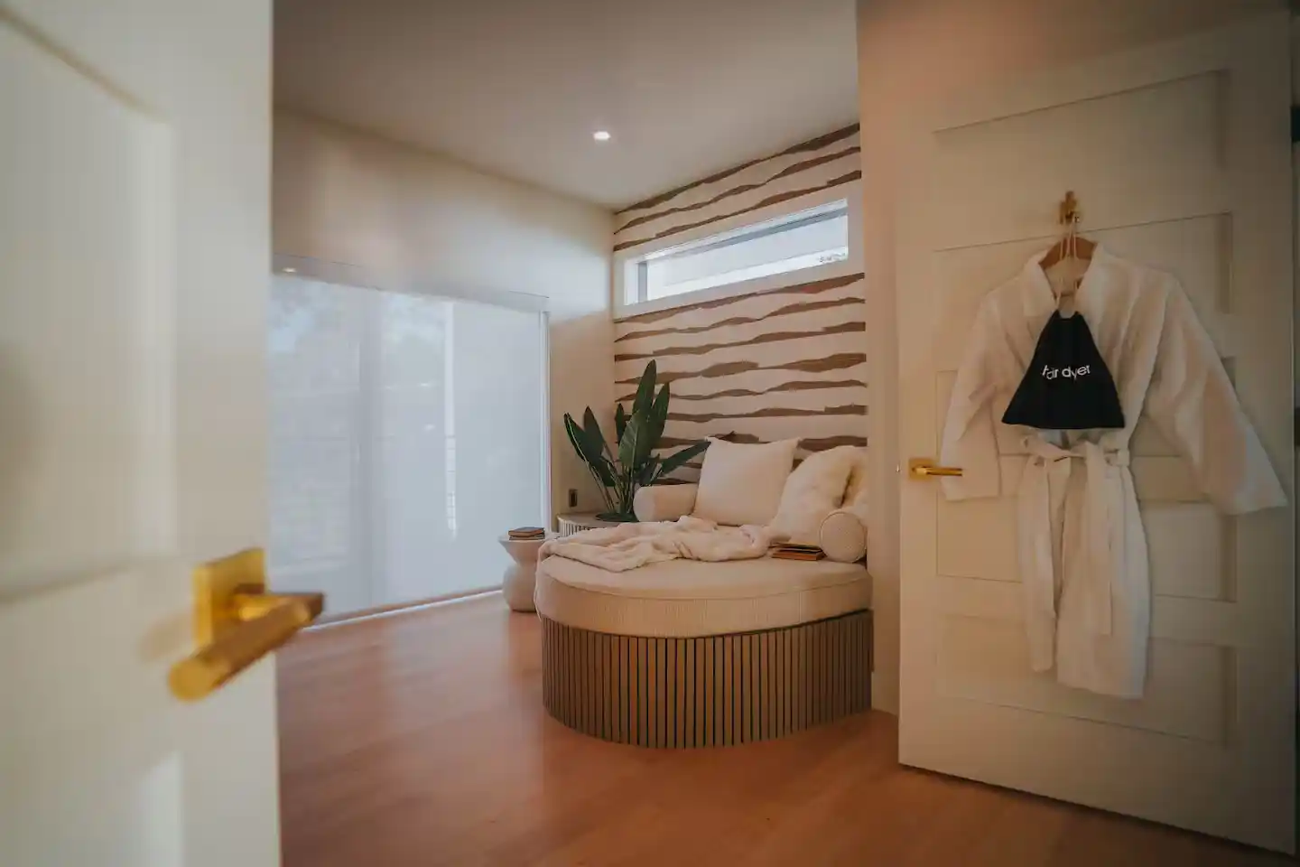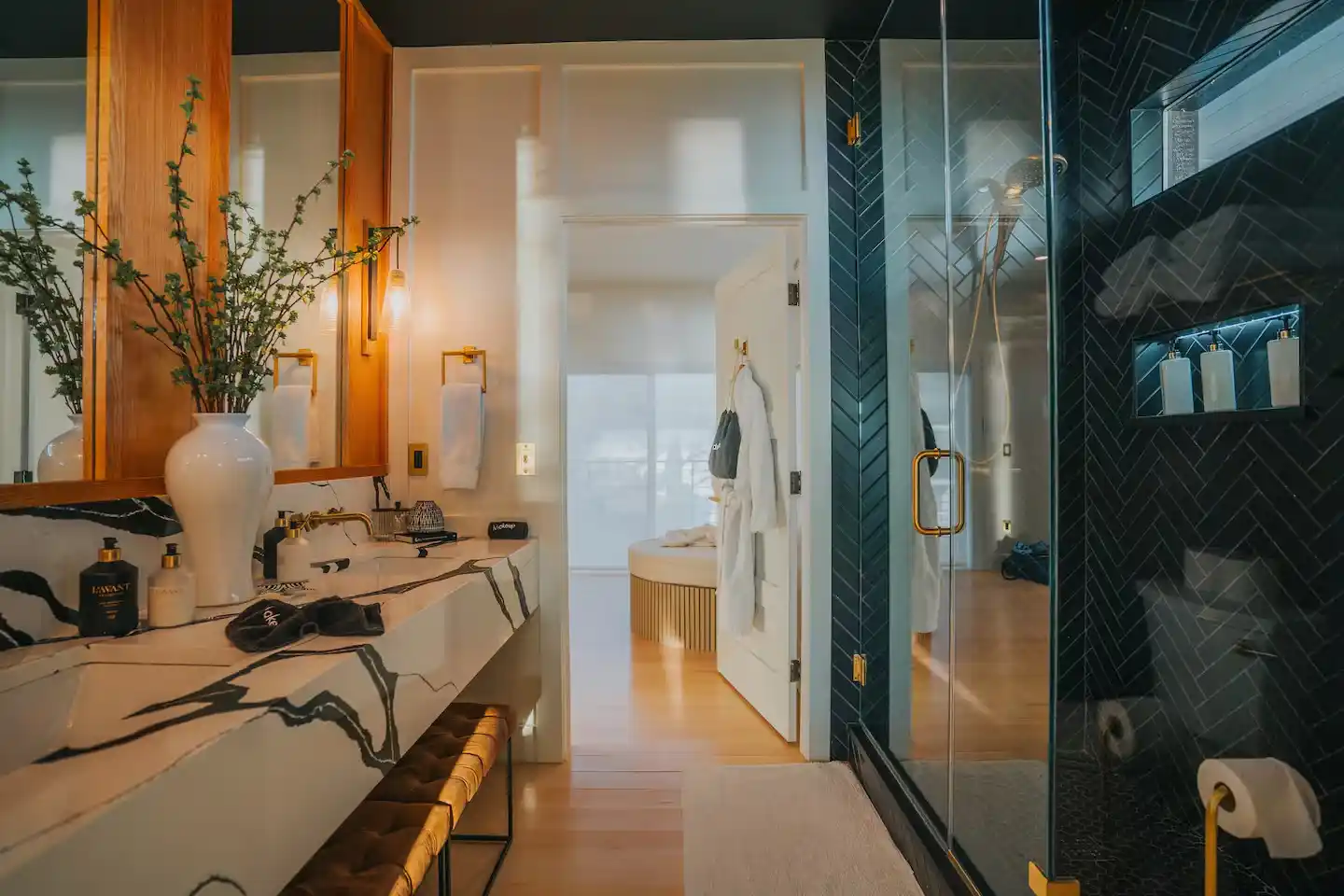 This home features a full bathroom with a high-end spa lounge, guaranteeing unparalleled comfort and